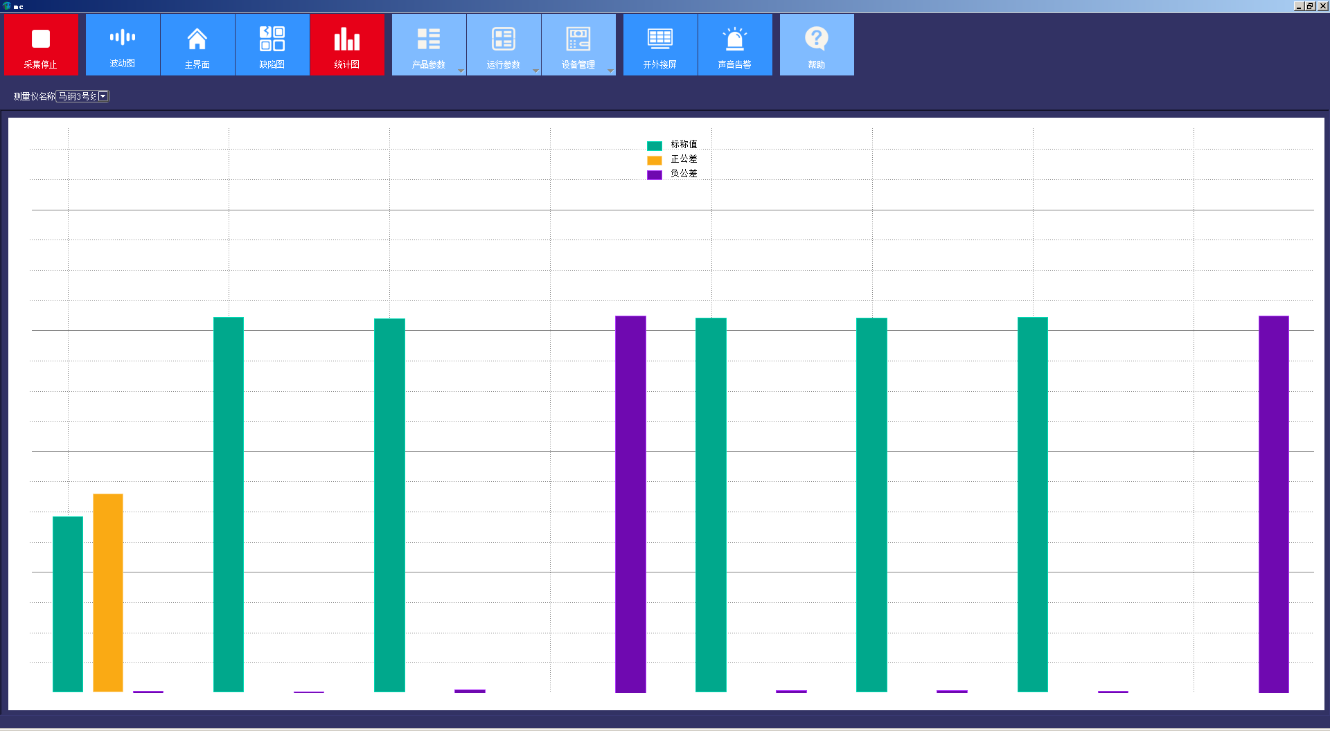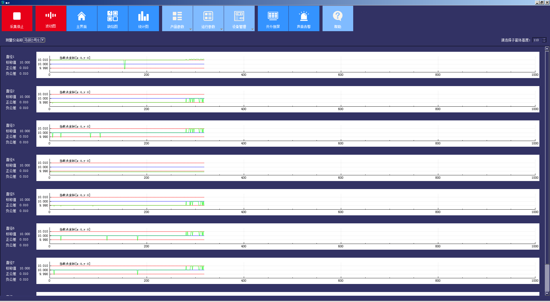 包括工具欄菜單,及主界面、波動(dòng)圖、缺陷圖、統(tǒng)計(jì)圖四個(gè)數(shù)據(jù)顯示窗口。